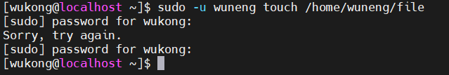 3、通过sudo使得wukong可以使用wuneng和wujing的权限在他们的家目录下创建普通文件file。