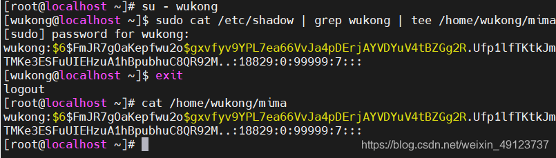 4、通过sudo使得wukong可以将密码配置文件中自己的密码信息相关内容保存至自己家目录下的mima文件。