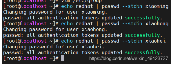 5、创建用户和组,新建一个名为adminuser的组,组id为3333;新建一个名为xiaoming的用户,将adminuser作为其附属组,且其uid为2003;新建一个名为xiaohong的用户,将adminuser作为其附属组;新建一个名为xiaohei的用户,其不属于adminuser组,其在系统中没有任何可交互的shell;三个用户的密码都是redhat。