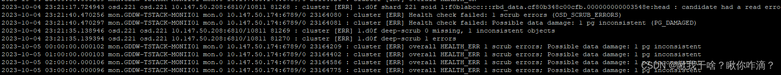 ceph-2集群运行状态异常, 发生时间:2023.10.04 23:24:47,当前值为:HEALTH_ERR 1 scrub errors; Possible data damage: 1 pg inconsistentOSD_SCRUB_ERRORS 1 scrub errorsPG_DAMAGED Possible data damage: 1 pg inconsistent pg 1.d0f is active+clean+inconsistent, acting [221,41,134]
