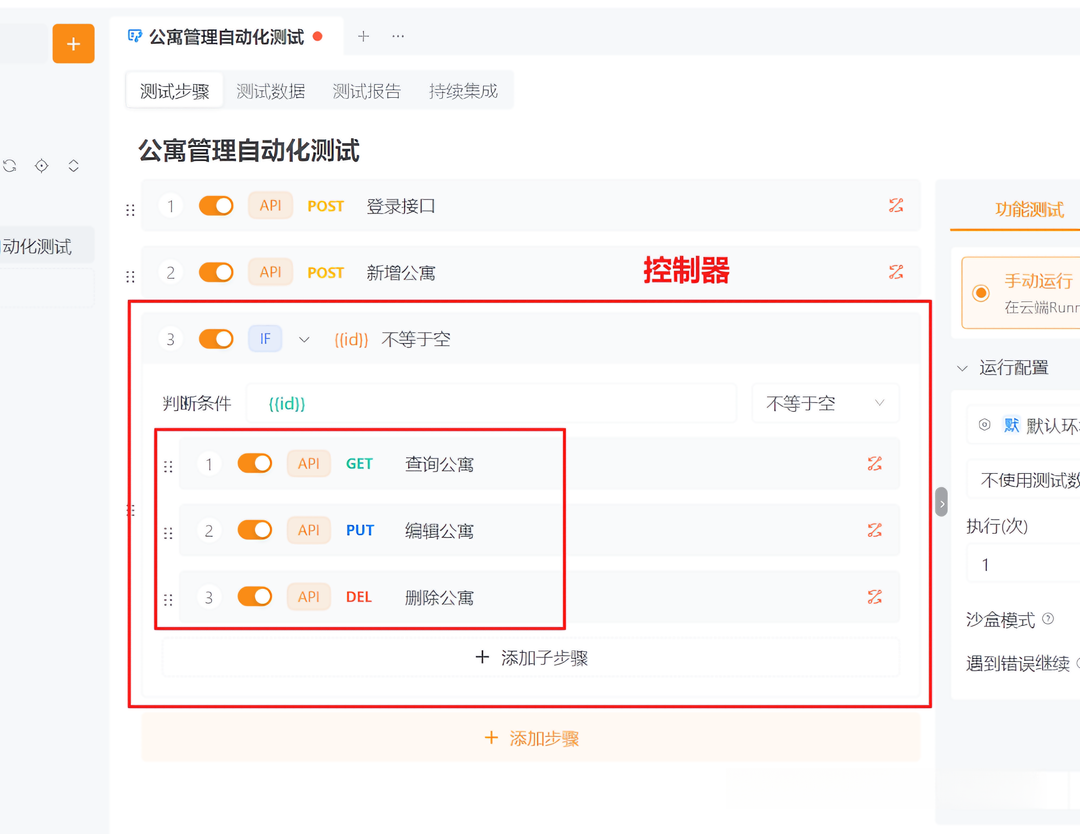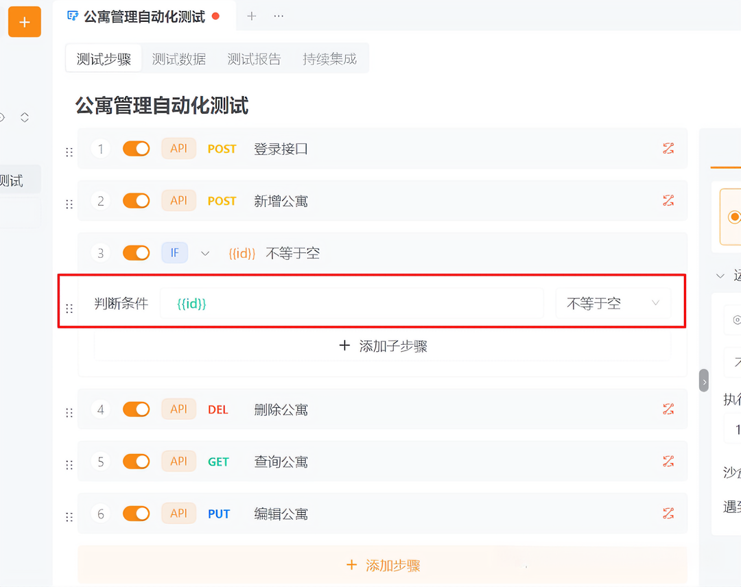 自动化测试目标:创建一个测试集,按“增->查->改->删”的顺序执行。关键在于,每一步都依赖于上一步的成功执行。例如,只有成功创建公寓后,才能用返回的Id去查询、更新和删除