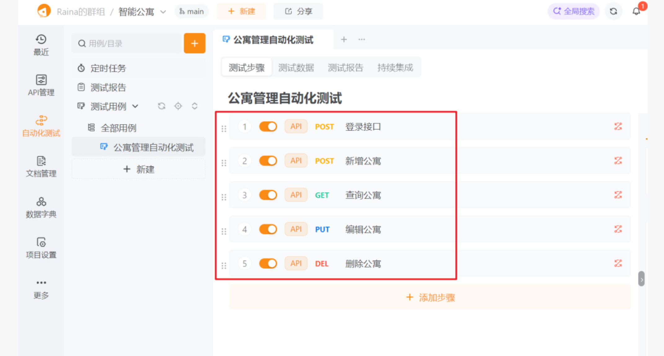 - 在Apipost-自动化测试中创建一个名为“公寓管理自动化测试”的测试集。