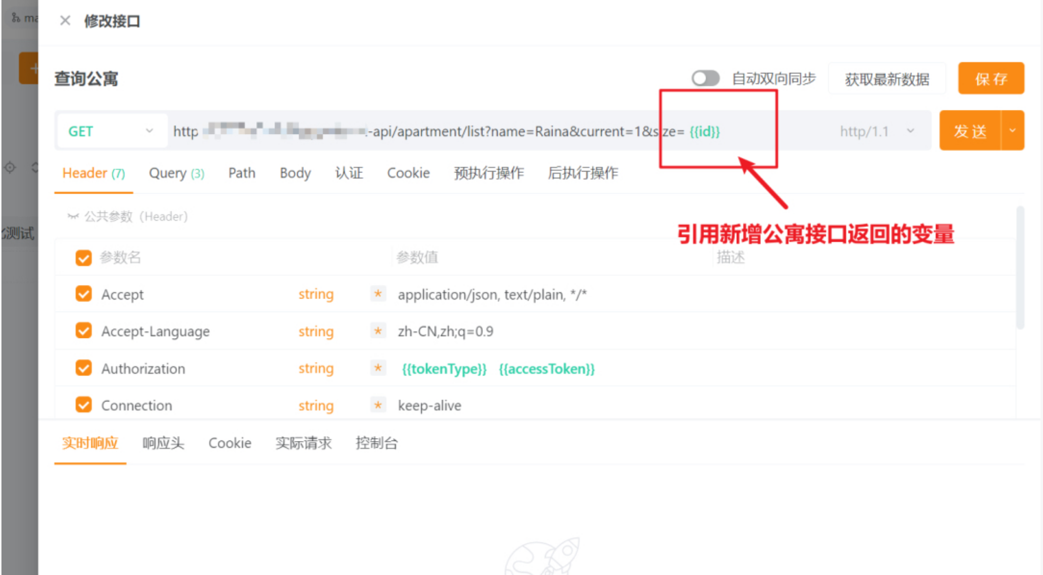 - {id} 是一个变量,它来自于前面新增公寓后返回的id 。