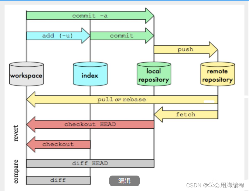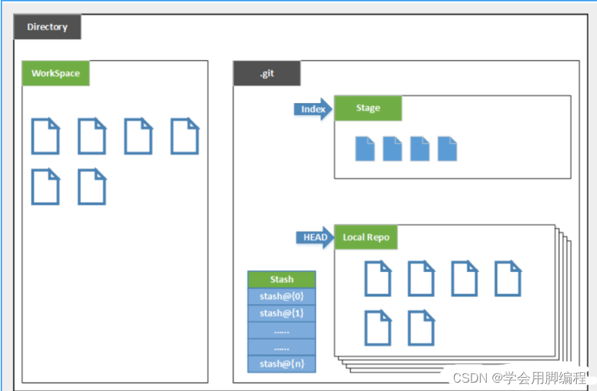 Local Repo:本地仓库,一个存放在本地的版本库;HEAD会只是当前的开发分支(branch)。