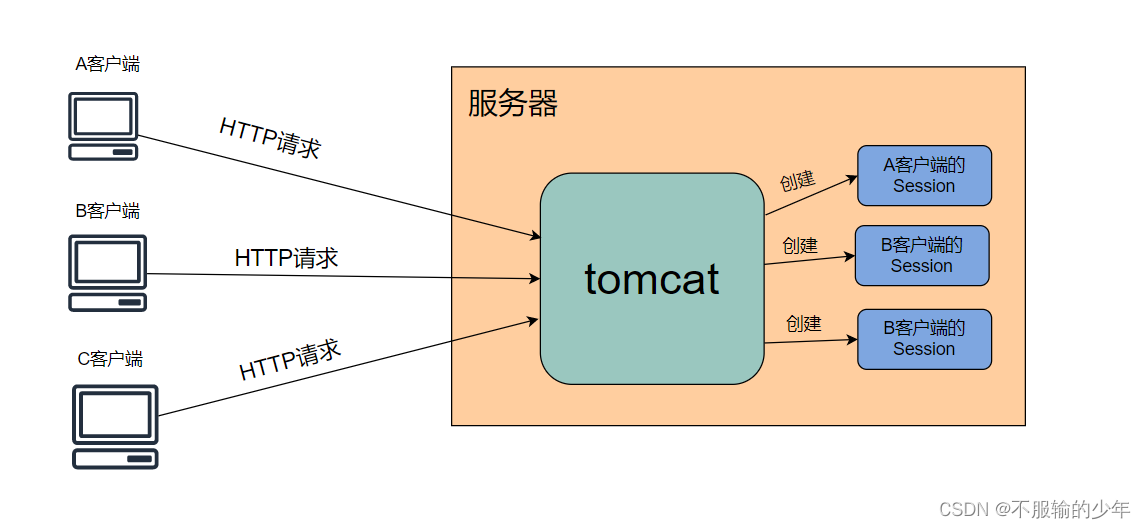 session是每一个游览器(客户端)所唯一的,这个是怎么实现的呢?其实,在访问一个网站时,在HTTP请求中往往会携带一个cookie,这个cookie的名字是JSESSIONID,这个JSESSIONID表示的就是session的id,这个是由服务器创建的,并且是唯一的。服务器在使用session时,会根据JSESSIONID来进行不同操作。下面我使用图示来进行说明