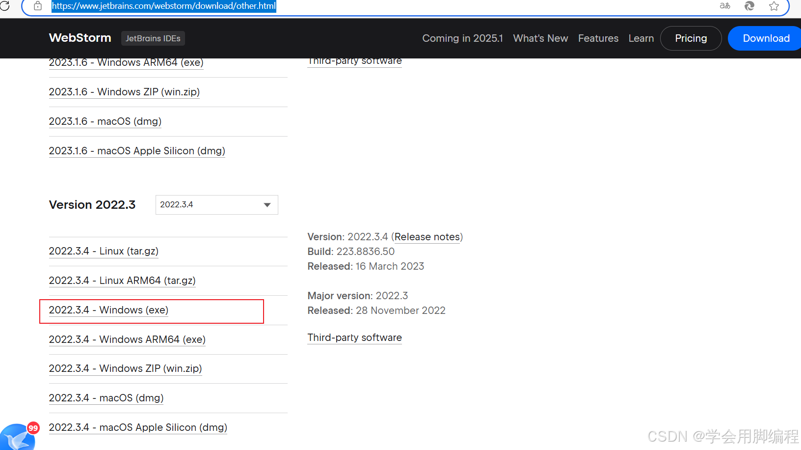 第一步:首先到官网下载所需要的WebStorm版本,(这里我选择的是2022.3.4版本)