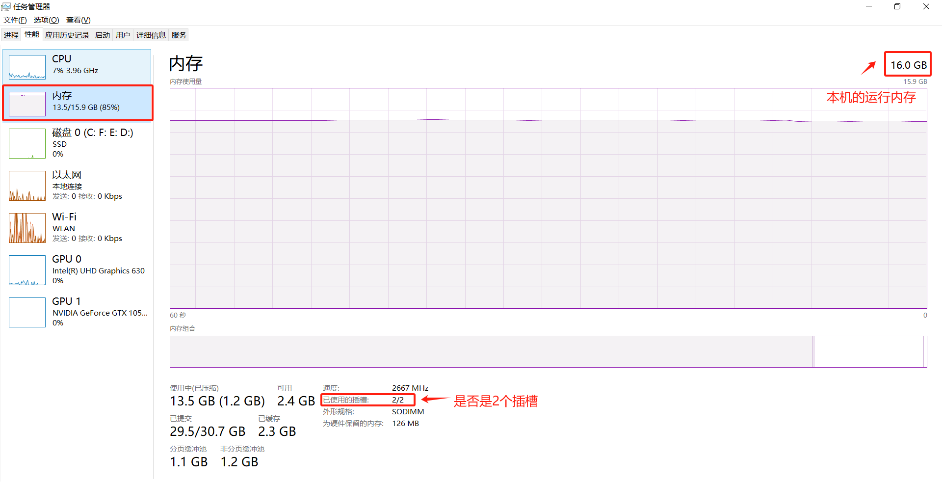 Ctrl + Shift + Esc打开任务管理器,切换到“性能”标签页,点击“内存”,查看:(推荐方便快捷)-