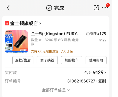 我选的金士顿的 DDR4-2666 SODIMM 8GB 内存 ¥129