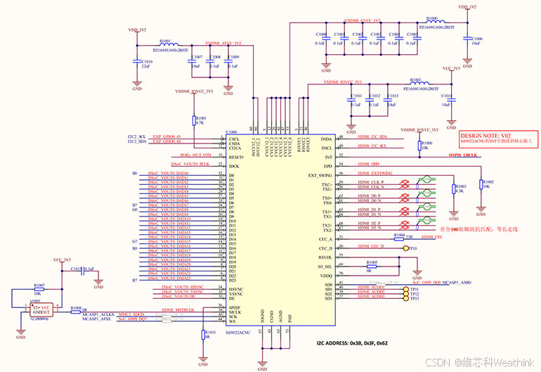 各电源引脚需单独去耦,减少高频噪声影响。对于 HDMI 输出,需要额外提供 5V 电源供电给外接设备(通过 HDMI VCC)。