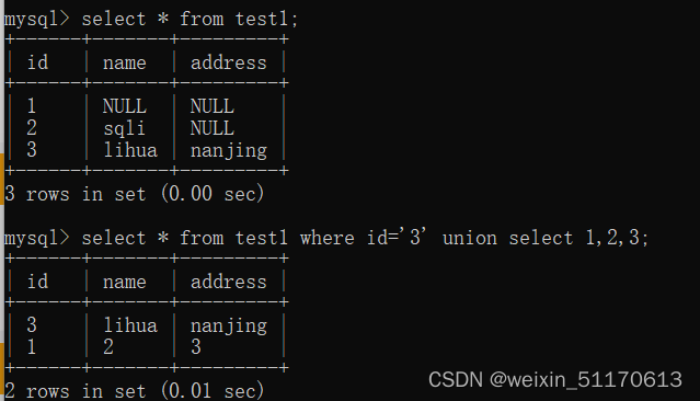 可以看到,test1表中共三个字段,union后的select 1,2,3直接输出了1,2,3,这样就很直观了。