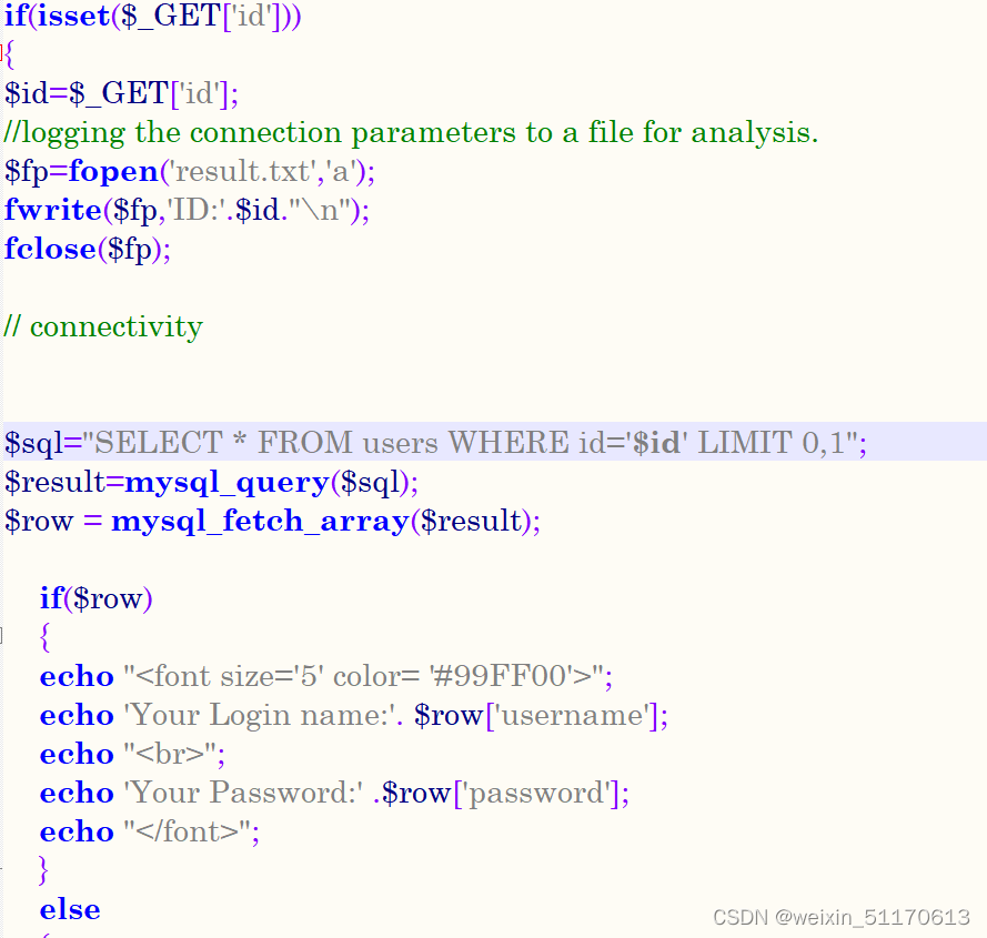 在sql语句拼接时,用的是id=‘$id’,说明id是字符型字段,也就是说当我们输入参数id=1 and 1=1时,拼接的sql语句是