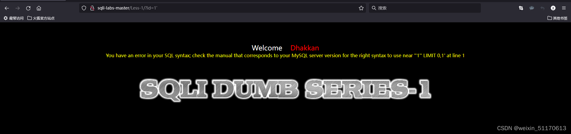 可以看到这时回显错误,数据库报错显示语法错误,原因是拼接的SQL语句最后有一个limit 0,1,limit是分页查询,limit 0,1的意思是显示第一页的一条数据,而且前面还有一个代码中自带的引号没有注释掉,所以会显示语法错误,这时使用--+或者--%20来注释掉后面的引号和limit