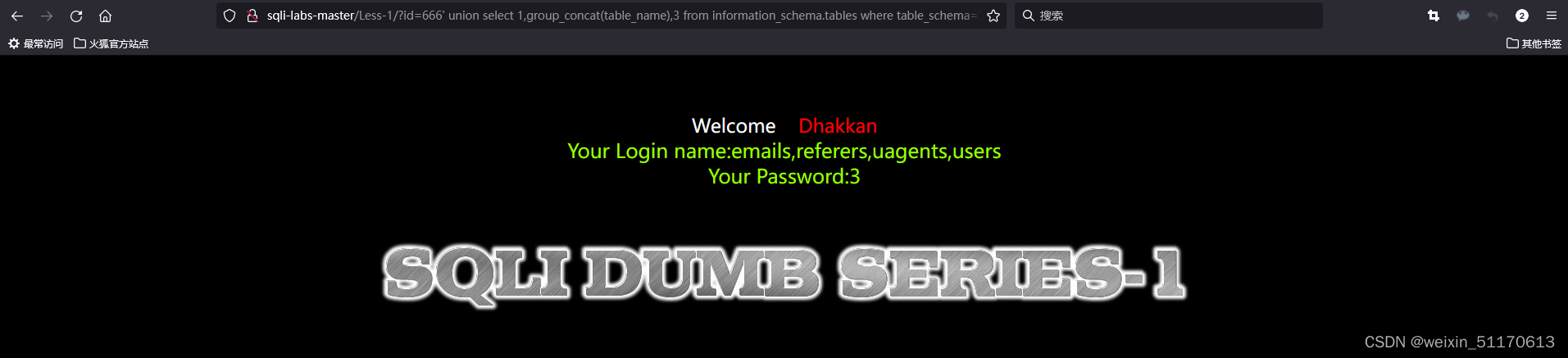 union后的select的语句意思是从 information_schema.tables数据库中查询security数据库中的所有表名。可以看到一共有四个表,其中的users是我们要用的表。
