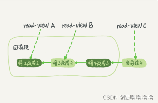 在 MySQL 中,实际上每条记录在更新的时候都会同时记录一条回滚操作。记录上的最新值,通过回滚操作,都可以得到前一个状态的值。
