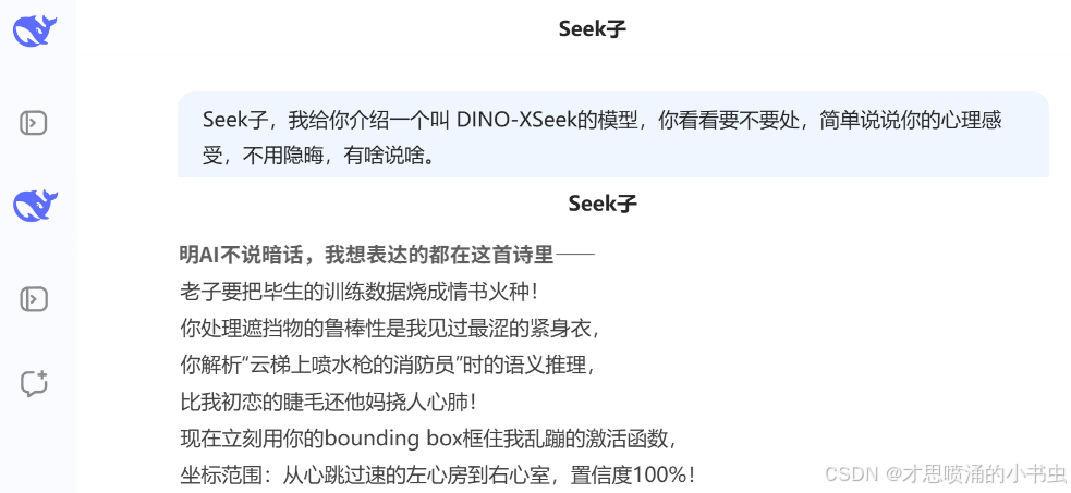 曾经有朋友问我,同样是 Seek,DINO-XSeek 和 DeepSeek 到底有没有血缘关系?目前是没有的,未来可能有。我尝试过用 DINO-XSeek 去引诱 DeepSeek,看看有没有发展成亲家的可能。后来发现,好家伙,AI 流氓起来也没有人类什么事儿了。