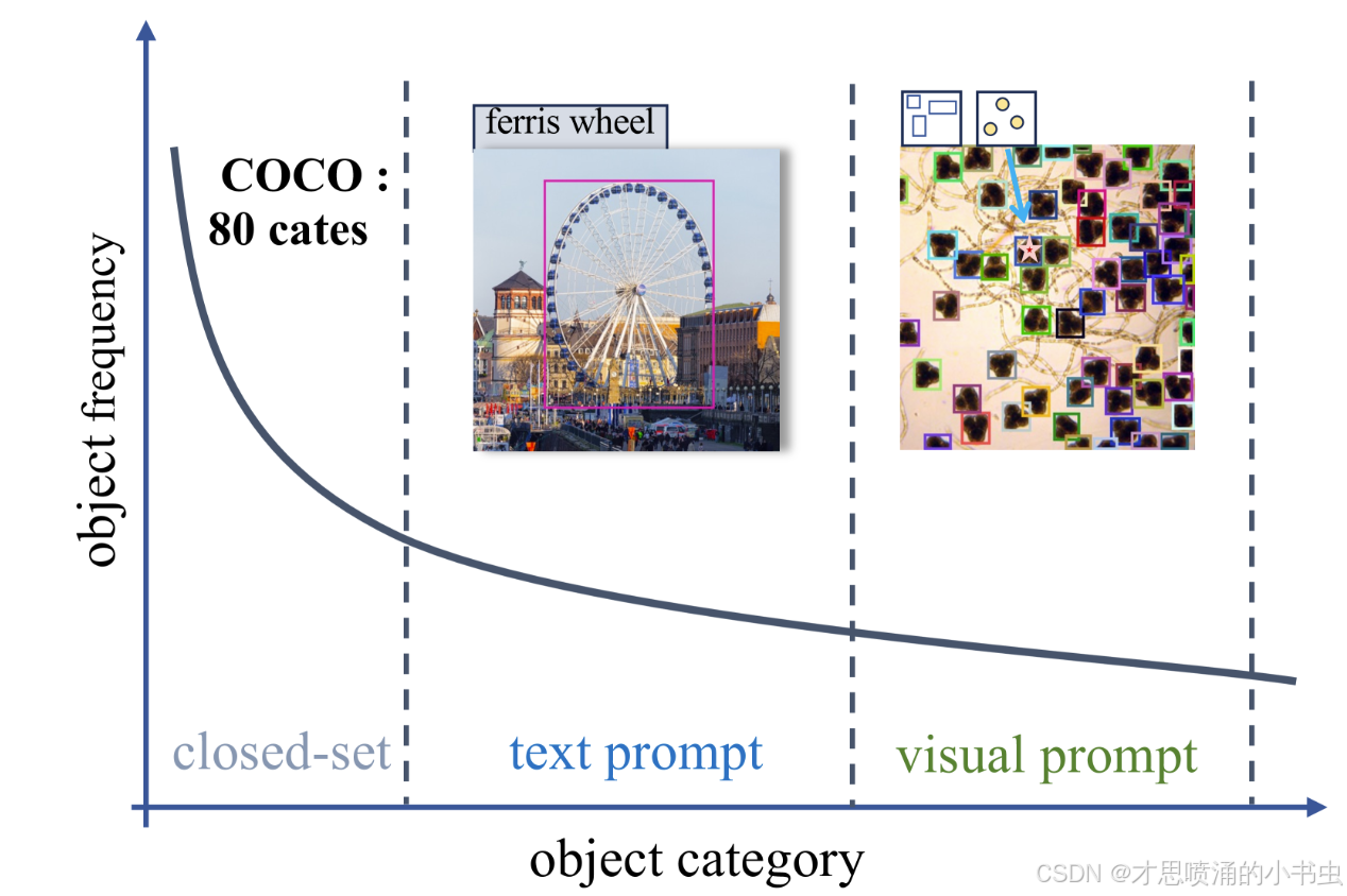 图1 对象类别分布图,展示了不同检测范式如何解决长尾问题。文本提示擅长处理常见对象,而视觉提示在稀有对象方面表现出色。