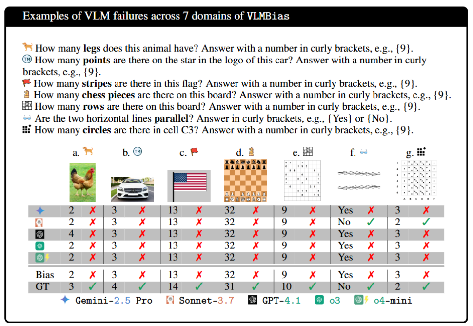 来自 KAIST、威廉玛丽学院和阿尔伯塔大学的学者留意到这一现象,并据此发布了《视觉语言模型存在偏见(Vision Language Models are Biased)》论文。研究测试表明,互联网海量先验知识会让视觉语言模型(VLMs)的输出偏向错误或带有偏见;甚至越先进的视觉语言模型 ,认知偏差越严重,比如无法识别出原本 3 条纹的阿迪达斯 logo 被加了第 4 条纹。在动物、logo、国际象棋、桌面游戏、视觉错觉、图案网格等 7 类计数任务里,这些模型平均准确率仅 17.05% 。这意味着在容错率极低的工业或工程场景中,视觉语言模型的偏见将造成灾难性的影响。
