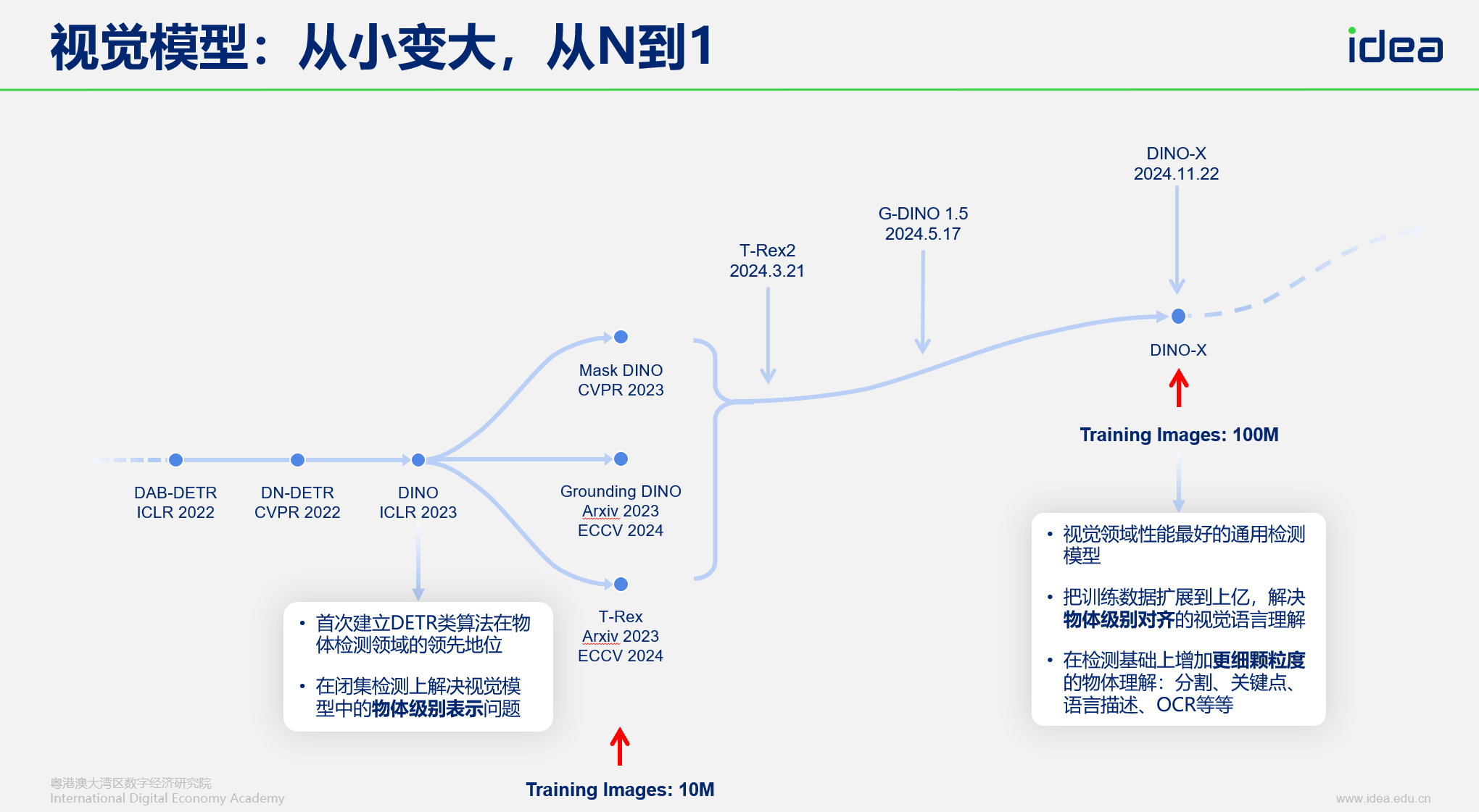 DINO-X 的愿景是通过精准的物体理解,让 AI 融入日常,实现与现实世界的无缝交互。从主流多模态模型以知识为基石去“看到”世界,到 DINO-X 以万物检测为基石开辟出 “看清” 世界的新路径,我们看到了 AI 在与现实世界交互中不断突破的可能。随着技术的不断迭代,以 DINO-X 为代表的创新模型,将推动 AI 真正跨越从“看到” 、“看清”,再到“看懂” 的鸿沟,为构建更智能、更可靠的未来世界提供支持。