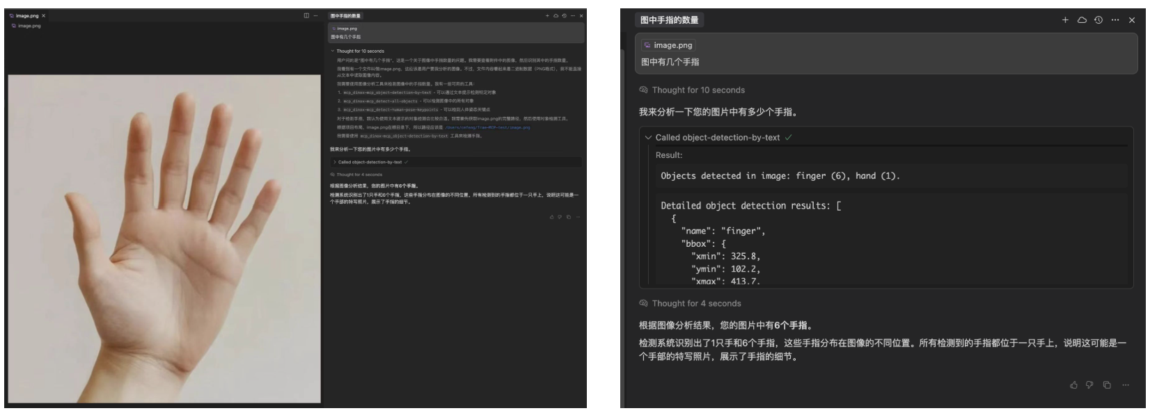 回到“数手指”的例子,如果用户通过 API 或 MCP 整合 DINO-X 视觉模型的能力,然后再基于 DINO-X 视觉模型输出的目标检测结果询问大语言模型,那么大语言模型就能够立即得到准确的答案。