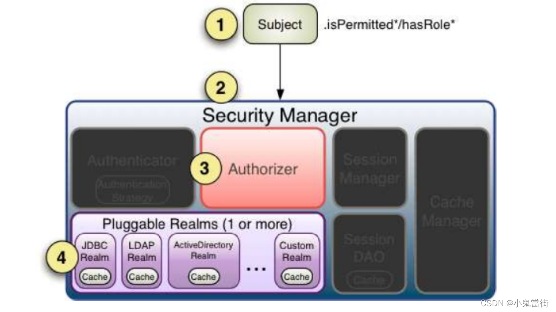 - Authrizer:授权器,或者访问控制器,用来决定主体是否有权限进行相应的操作;即控制着用户能访问应用中的哪些功能