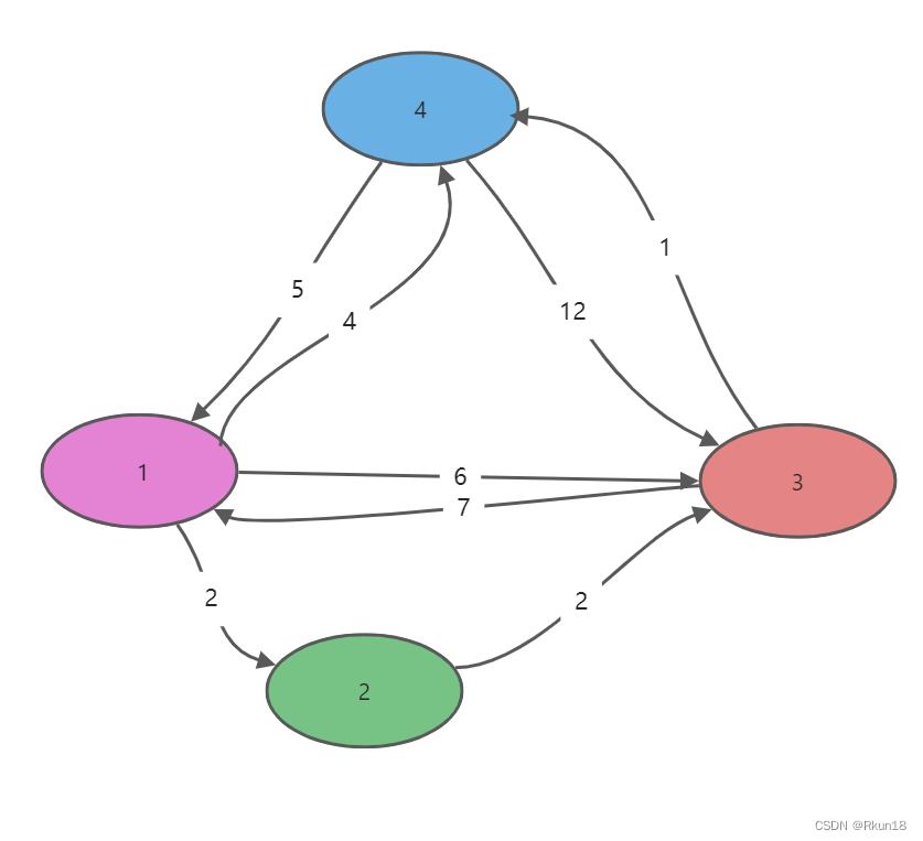 如上图的4号城市到3号城市,原本路程是a[4][3]=12,如果通过1号城市4->1->3路程将缩短为a[4][1]