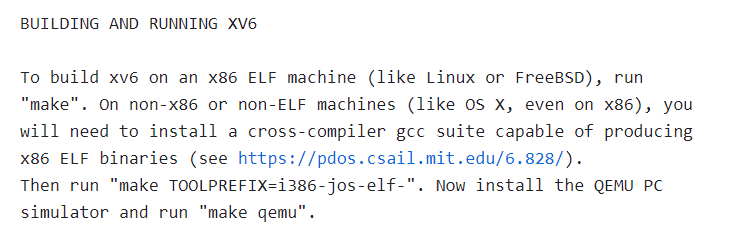 在 x86 ELF 架构的机器(如 Linux 或 FreeBSD)上构建 xv6 时,请运行 "make" 命令。若在非 x86 或非 ELF 架构的机器(例如 OS X,即使是 x86 架构)上构建,您需要安装能够生成 x86 ELF 二进制文件的交叉编译器 gcc 套件(详见 https://pdos.csail.mit.edu/6.828/)。随后运行 "make TOOLPREFIX=i386-jos-elf-" 命令。接着安装 QEMU PC 模拟器并运行 "make qemu" 即可启动。