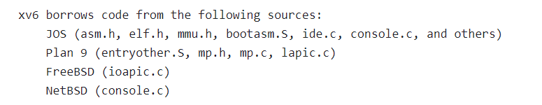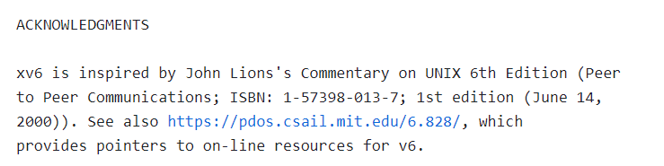 xv6 的灵感来源于 John Lions 对 UNIX 第 6 版的评论著作(Peer to Peer Communications 出版社;ISBN:1-57398-013-7;2000年6月14日初版)。