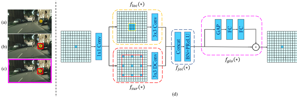 采用3×3空洞卷积(dilation rate=2或4)扩大感受野,捕获目标周围环境信息(红色区域),增强空间依赖性。