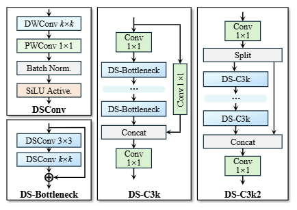 Conv 1×1**: 对拼接后的特征进行融合并调整到所需的输出通道数。 - 与经典C3模块的关联: 此结构类似于YOLOv5中的C3模块,但将其中的标准Bottleneck替换为了更轻量的DS-Bottleneck,故得名DS-C3k。