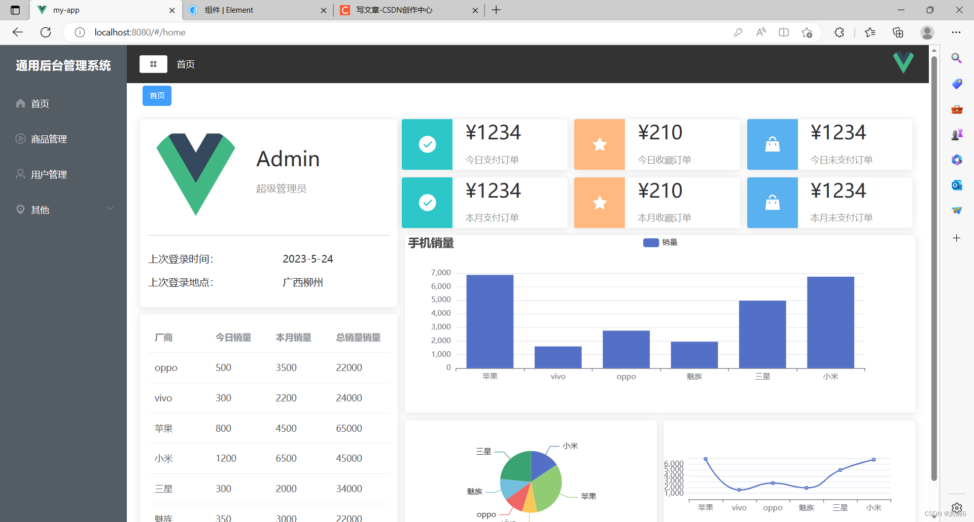 首页部分分为三部分,导航栏部分使用的是由Element ui 所提供的组件,主页面则使用 ECharts 对 mock 模拟的数据进行渲染,顶部 header 部分包含一个面包屑组件也可对页面进行跳转。