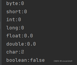 class Test{ byte a; short b; int c; long d; //整形 float e; double f; //浮点型 char g; //字符型 boolean h; //布尔型 } public class 缺省默认值 { public static void main(String[] args) { Test str =new Test(); System.out.println("byte:"+str.a); System.out.println("short:"+str.b); System.out.println("int:"+str.c); System.out.println("long:"+str.d); System.out.println("float:"+str.e); System.out.println("double:"+str.f); System.out.println("char:"+str.g); System.out.println("boolean:"+str.h); } }