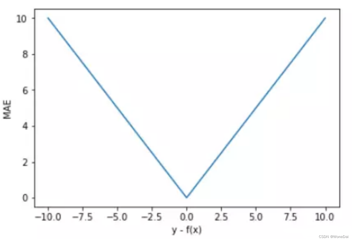 MAE 的曲线呈 V 字型,连续但在 y-f(x)=0 处不可导,计算机求解导数比较困难。而且 MAE 大部分情况下梯度都是相等的,这意味着即使对于小的损失值,其梯度也是大的。这不利于函数的收敛和模型的学习。
