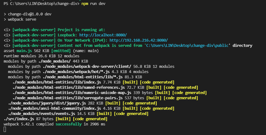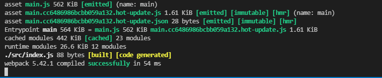 执行代码后,webpack-dev-server会启动一个实时打包的http服务器,终端会一直检测代码是否发生改变,当我们的代码发生改变时,就会webpack serve就会自动打包构建,例如当我们把change-div项目中的index.js代码的red改为blue并保存,webpack serve就会自动打包构建,如下图所示: