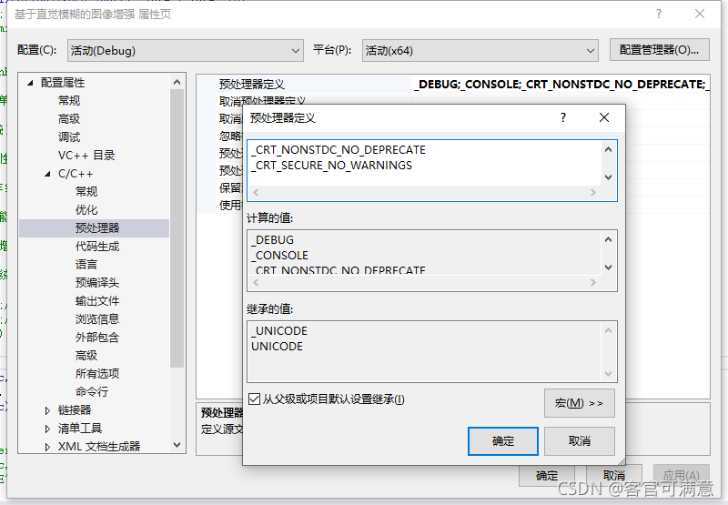 fopen()调用时报错,在项目属性->C/C++->预处理器->预处理器定义->编辑添加下面俩个宏: