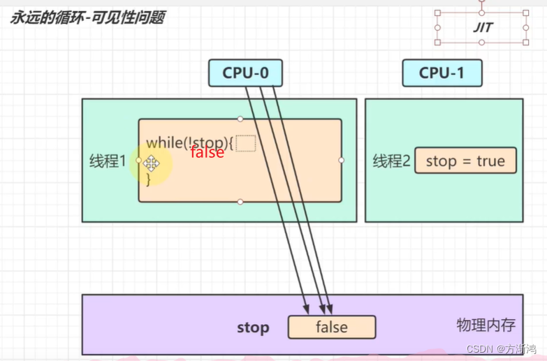 可见性:当一个线程1执行一个代码时,循环条件是一个内存里的共享变量stop,会一直判断stop是false(大概一秒钟可以判断一千万次),达到一定的阈值后JIT(java的一个编译器),认为线程1的代码一直为false,为了提供效率,就会去修改线程1的代码,把stop直接就改为false;这样线程2去把stop修改为true之后,线程1的循环也不会退出,因为他已经被改了代码,所以他压根就看不到共享变量的值被修该为true;