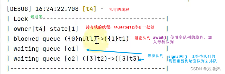 - signalAll():使等待队列的线程重新返回阻塞队列,等待持有锁的线程释放锁