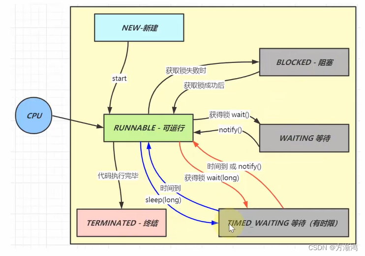 - RUNNABLE:可运行 —-会被CPU执行