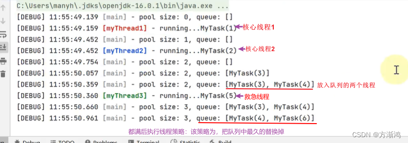 private static void testNewRunnableTerminated(){ // 线程工厂对象 AtomicInteger c = new AtomicInteger(1); // 工作队列对象 ArrayBlockingQueue<Runnable> queue = new ArrayBlockingQueue<>(2); ThreadPoolExecutor threadPool = new ThreadPoolExecutor( 2, //核心线程 3, //最大线程 0, //救急线程生存时间 TimeUnit.MINUTES, //救急线程生存单位 queue, //堵塞队列 r -> new Thread(r,"myThread" + c.getAndIncrement()), //线程名字 // 执行的拒绝策略:1.抛出异常 new ThreadPoolExecutor.DiscardPolicy()); }