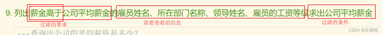 需要查看的数据则使用select得出,中间需要使用的表写在from里,后面需要求的平均工资就为过滤的条件