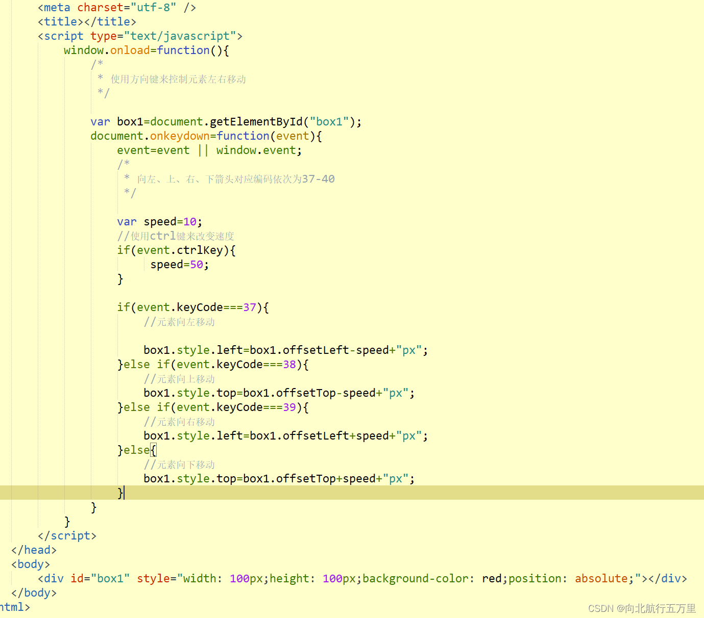 本文介绍了JavaScript中按键事件的使用,强调了onkeyup事件的特性,即按键松开时仅触发一次。同时,讲解了如何通过keyCode属性判断用户按下了哪个键,并提供了示例。此外,还探讨了如何取消文本框的默认输入行为以及利用键盘移动元素位置的实战技巧。