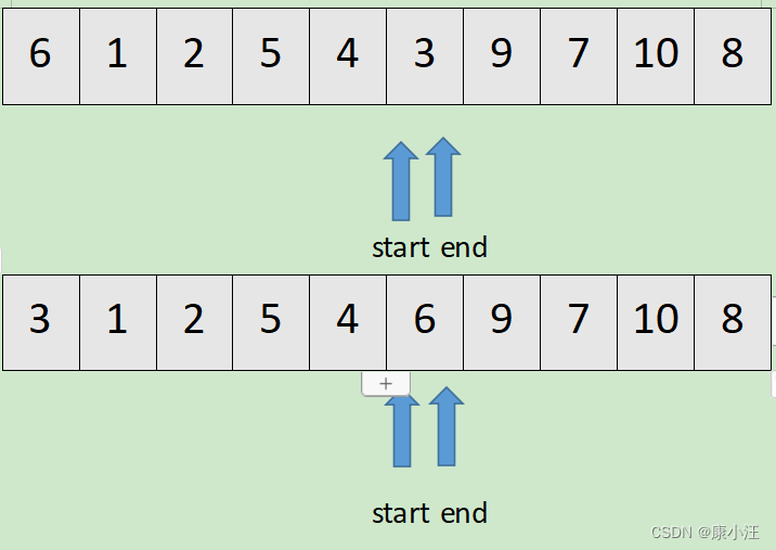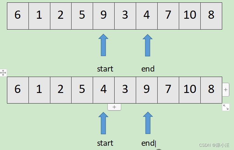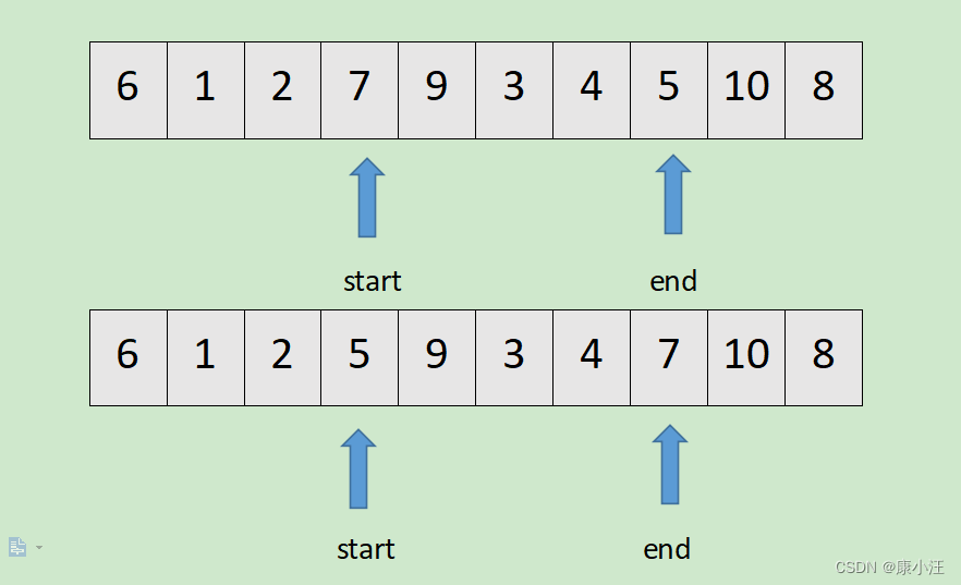 首先用end扫描数组,如果end指向的值小于基准数,继续用start扫描数组,否则执行end-1,直到end指向的值小于基准数。