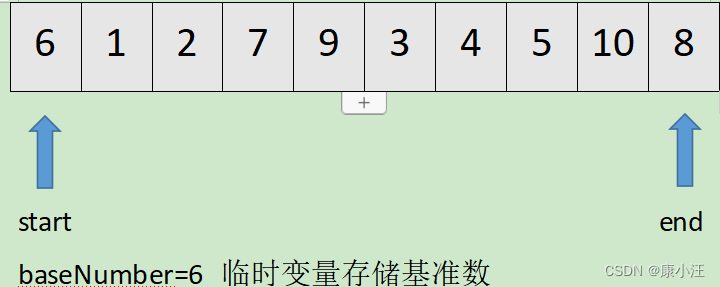如下图所示,将数组的第一个元素作为基准数,首先用一个临时变量存储基准数,然后从数组的两端扫描数组,start指向起始位置,end指向末尾位置。