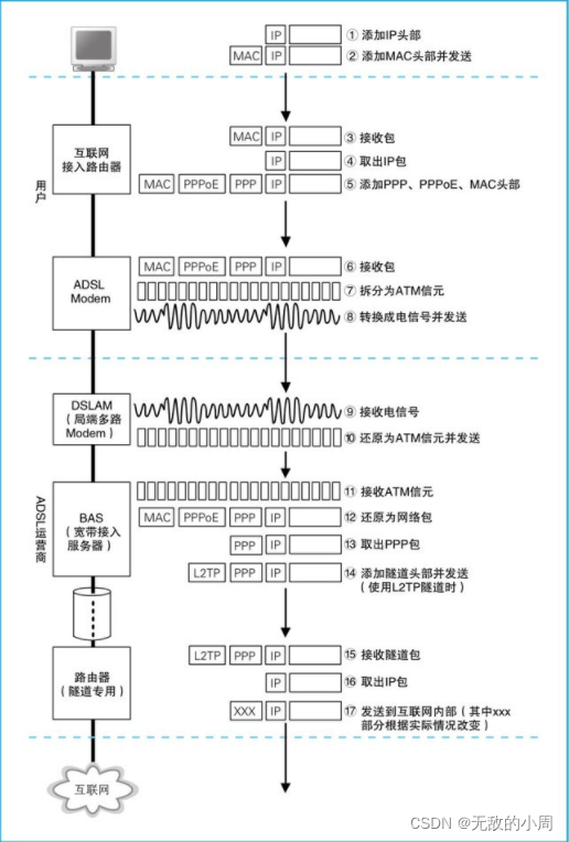 用户端路由器发出的网络包通过ADSL Modem(调制解调器)到达电话局,再到达ADSL网络运营商(ISP)。