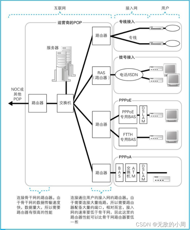 ADSL、FTTH等接入网是与用户签约的运营商设备相连的,这些设备称为POP(Poine Of Presense 接入点)。到达互联网的入口,运营商POP路由器。