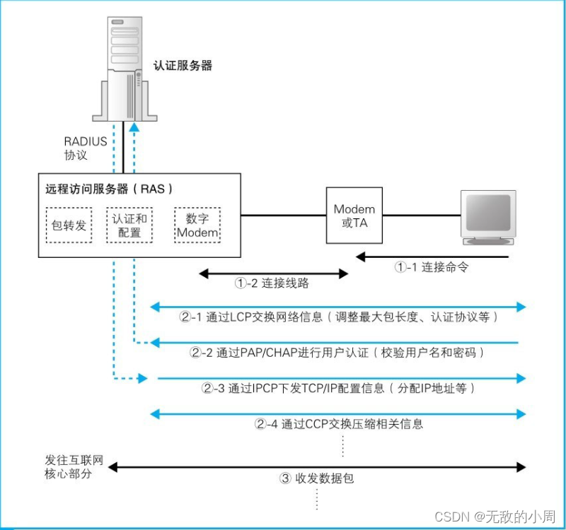 1.用户向运营商的接入点拨打电话,输入用户名和密码