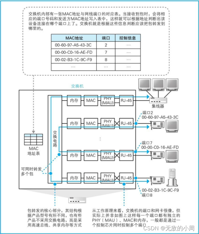 2.相对地,集线器会将输入的信号广播到所有的端口,如果同时输入多个信号就会发生碰撞,无法同时传输多路信号,因此从设备整体的转发能力来看,交换机要高于集线器。