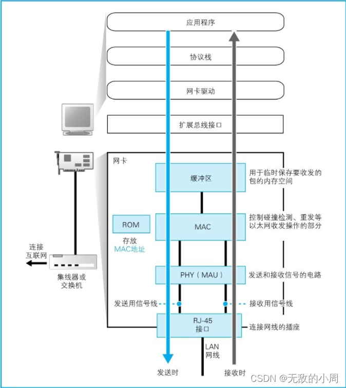网卡:完成实际收发操作。对网线中的信号执行发送和接收。