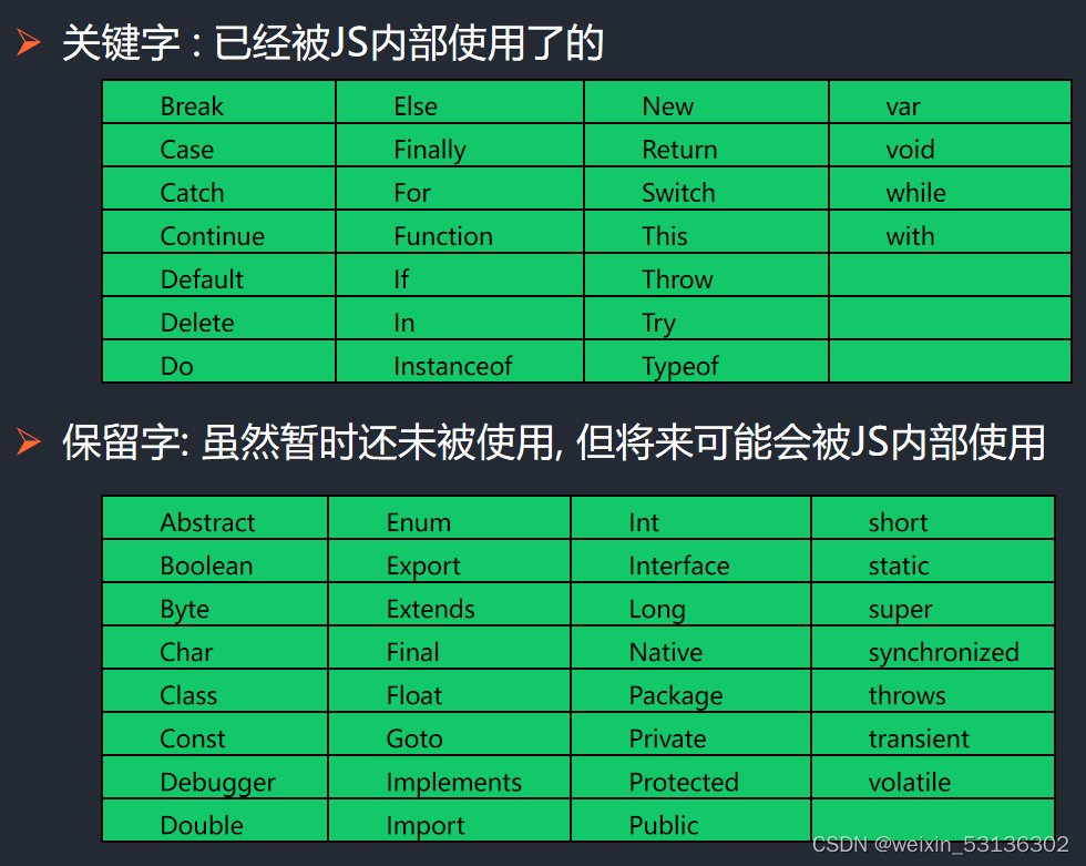 - 他是一个弱语言(他没有固定 的类型划分 你给定的值是什么类型 他就是什么类型)