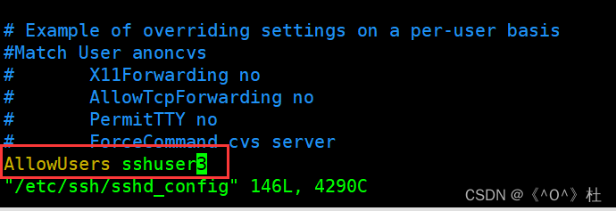 用户创建完成,进入配置文件在最后添加可以登录的用户sshuser3,配置完成保存退出重启sshd。